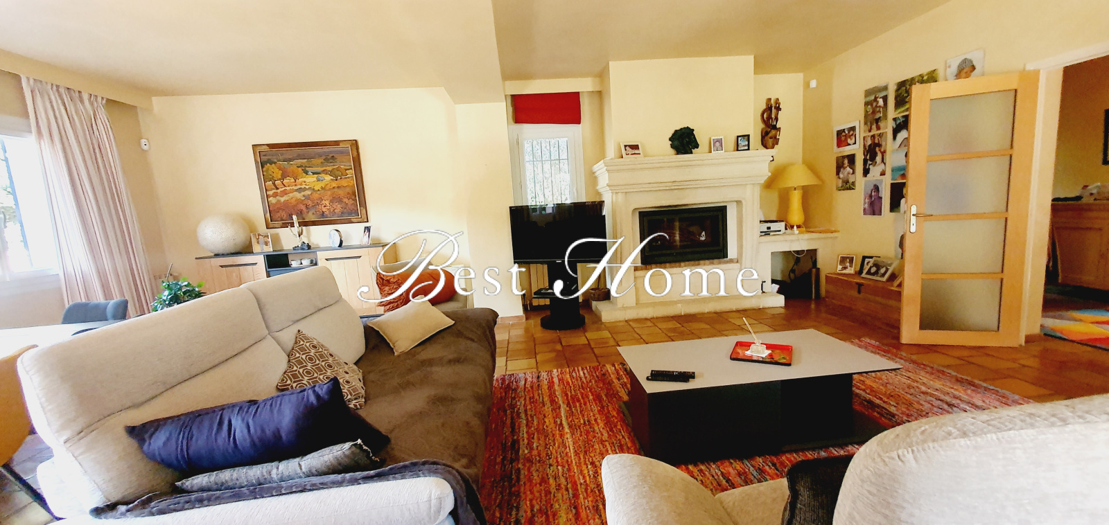 Les prestations sont au rendez-vous : portail automatique, double vitrage pvc de partout, pompe à chaleur et climatisation réversible. Sol en terre cuite.